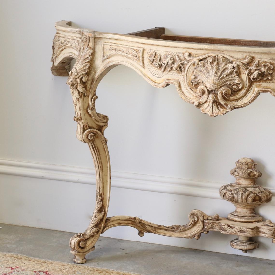 A Louis XV period console table purchased in northern France. The console's distressed gesso finish highlights the carved detailing on its skirt and legs. The console would suit a glass or marble top.
