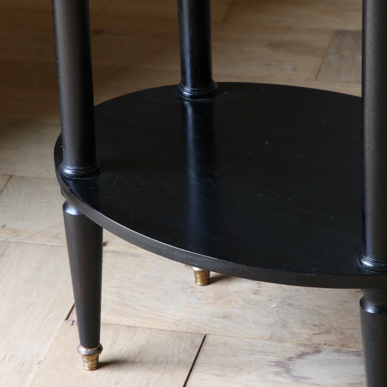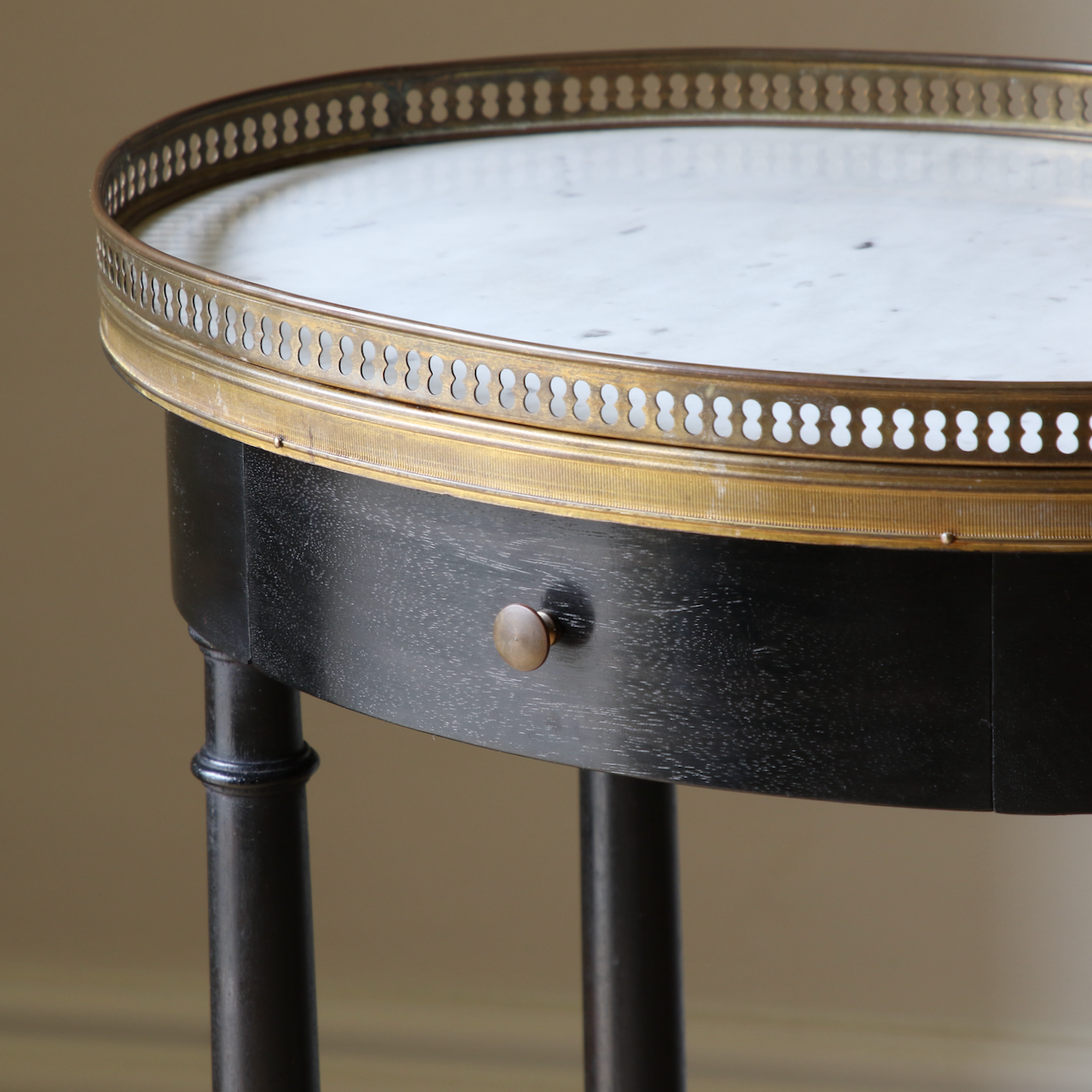 A very fine Louis XVI galleried occasional table with elegant fluted legs and a lower shelf, which adds stability. The marble is surrounded by a delicate pierced brass gallery, ensuring the third Pernod doesn't slip off the edge.