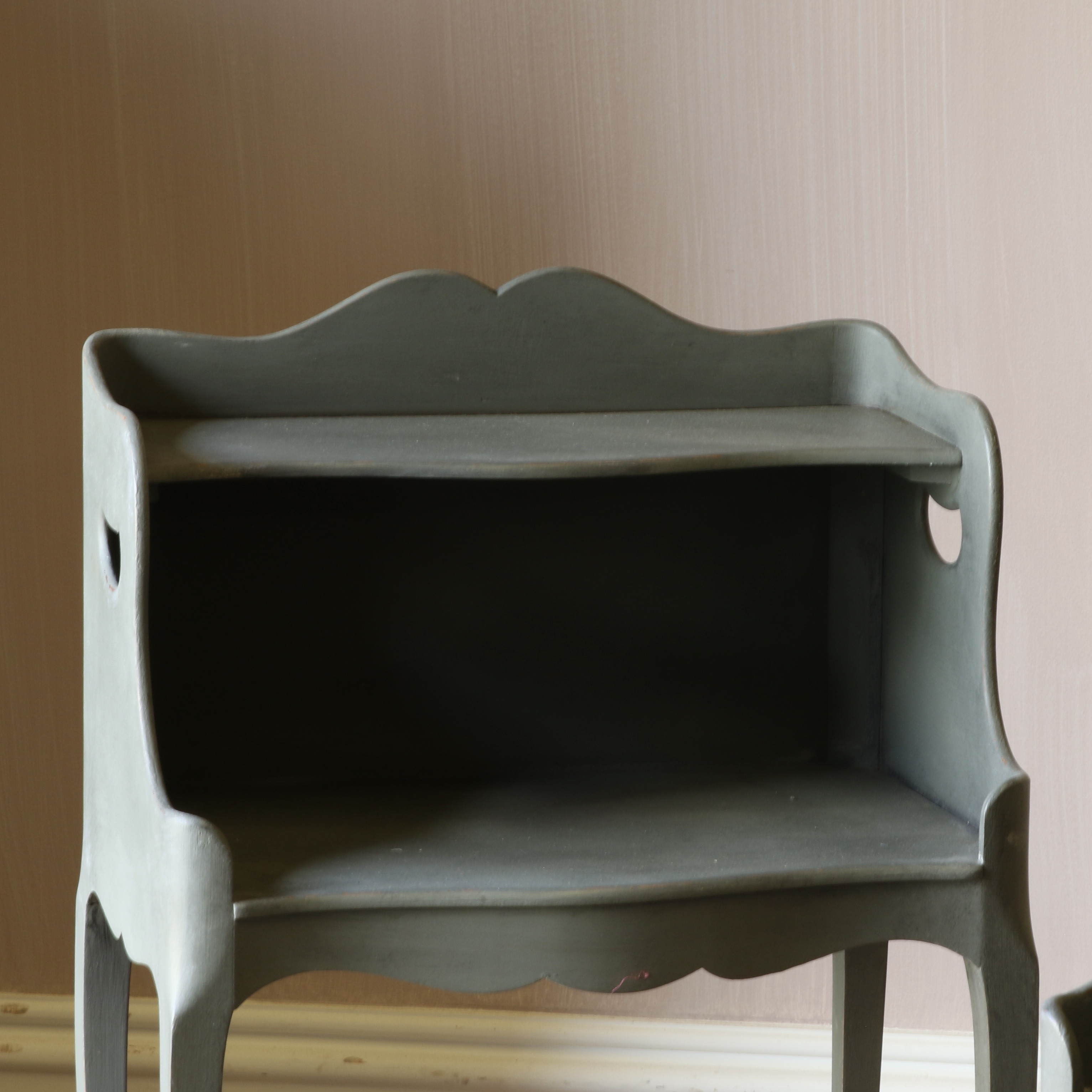 A graceful pair of Louis XV bedsides, with two open shelves, on cabriole legs. Refinished by Katrina in the perfect shade of eucalyptus.