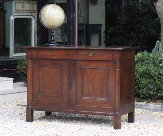 A French Empire dresser base, consisting of two-drawers over two planed and fielded doors flanked by circular pilasters, and panelled sides. The dresser has a vertical steel key escutcheon and key. It is an imposing piece at over 1m tall and 1.4m wide. It weighs a tonne and would suit a wall that needs a statement piece.