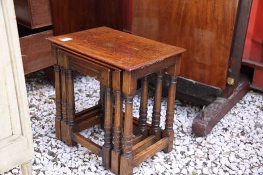 A great little set of English tables with ringed carving at the bottom of each leg. Excellent colour and useful size!