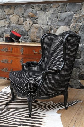 一对法国路易十五风格的翼椅,有黑色的光彩和密集钉钮的垫衬物。这惊人的一对椅已售。